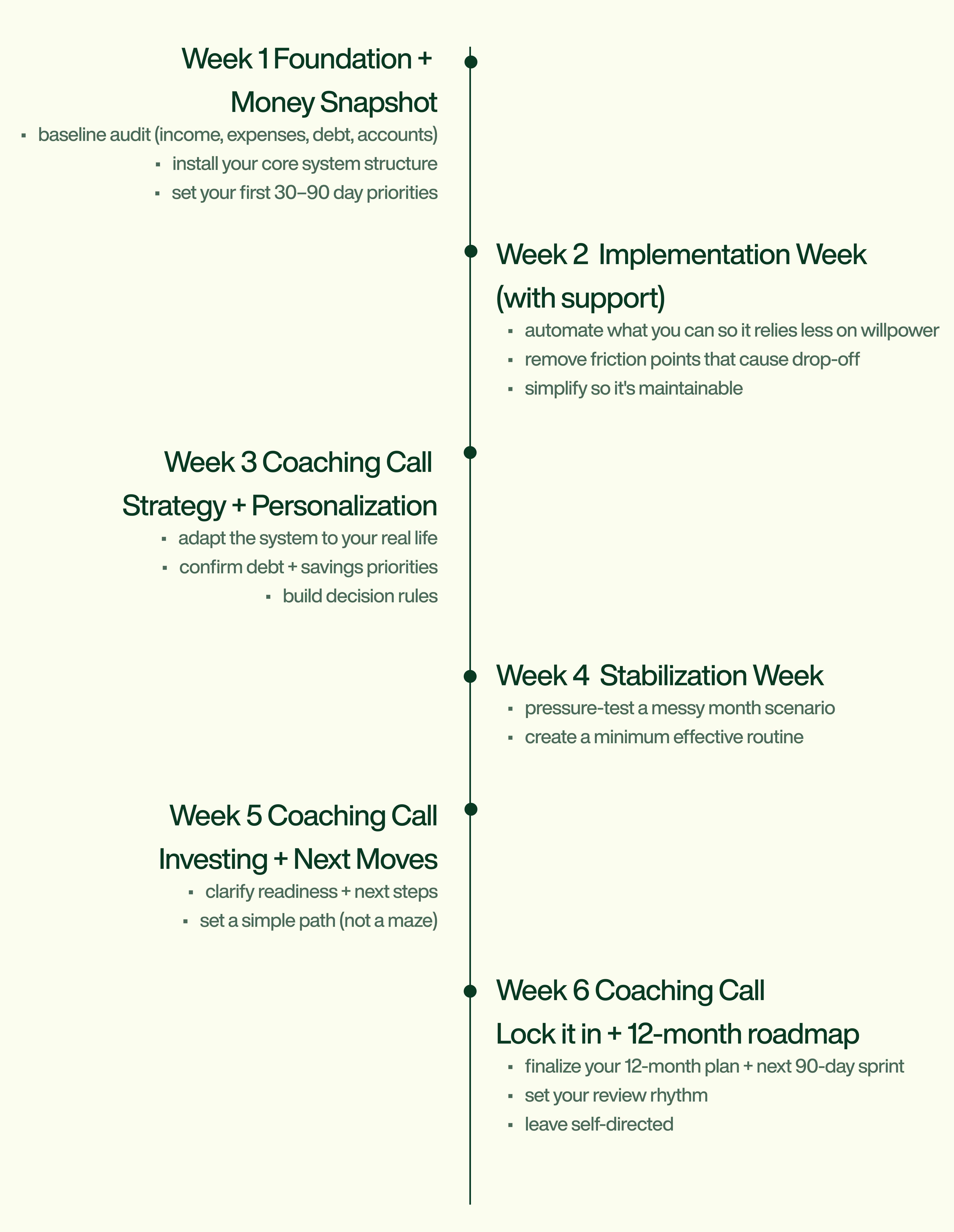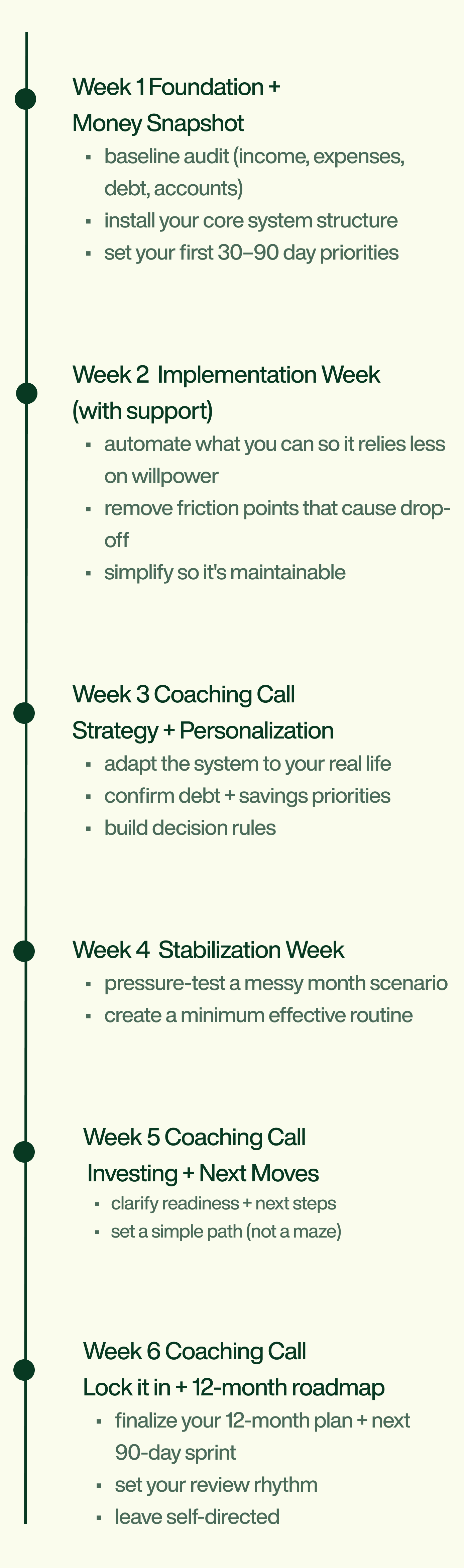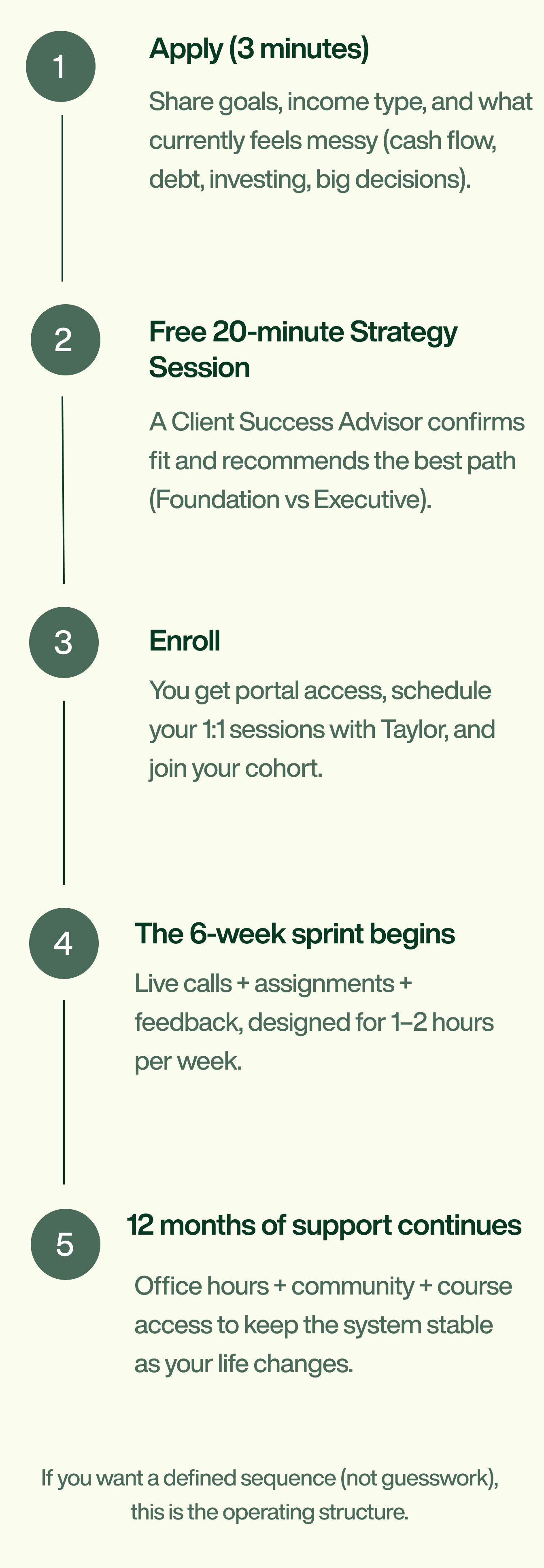 It is coaching, education, and implementation support. It is not tax prep, legal advice, or individualized investment product recommendations.