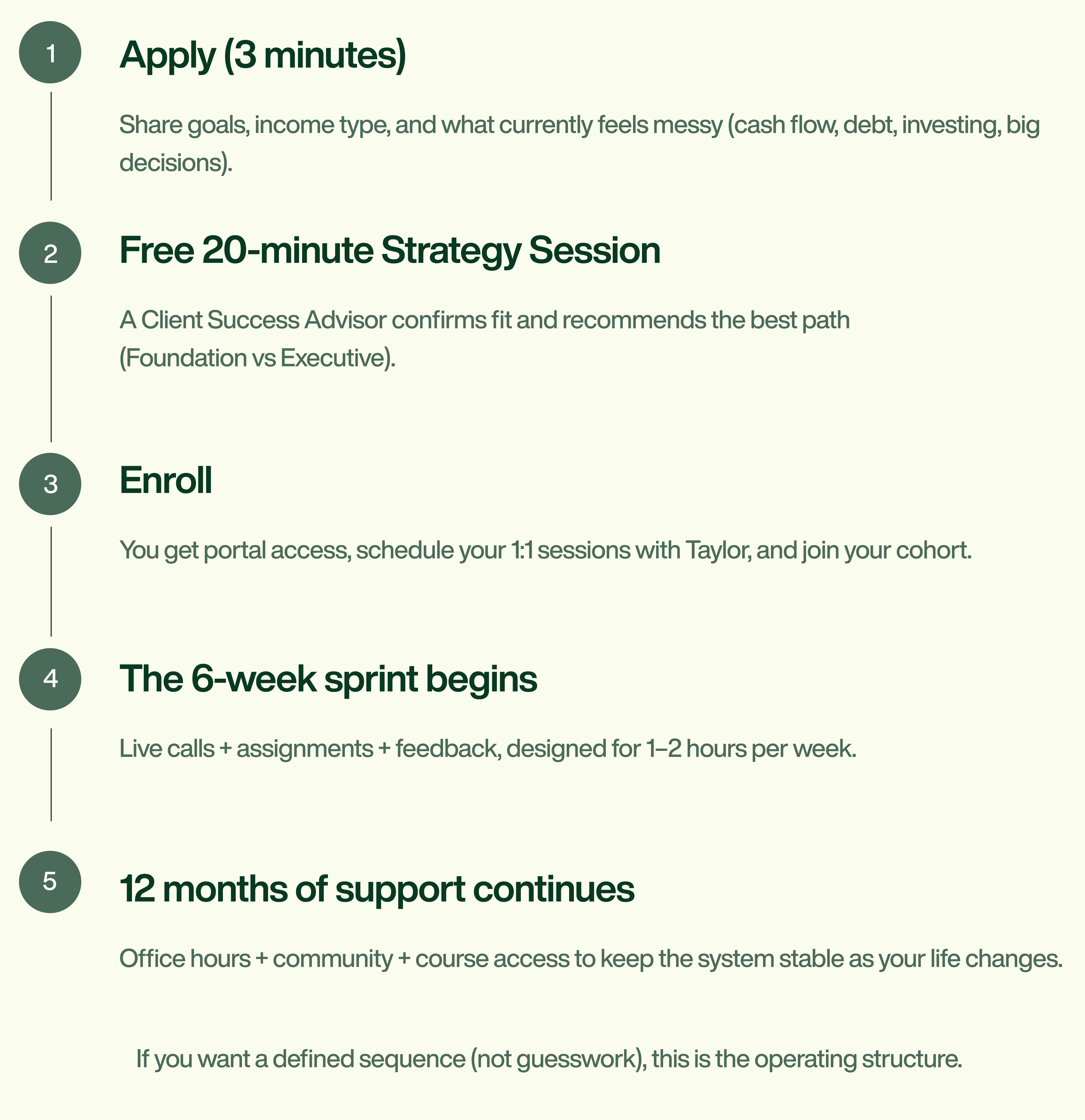 Executive Cohort is a small-group coaching experience to install a money system that holds up in real life.